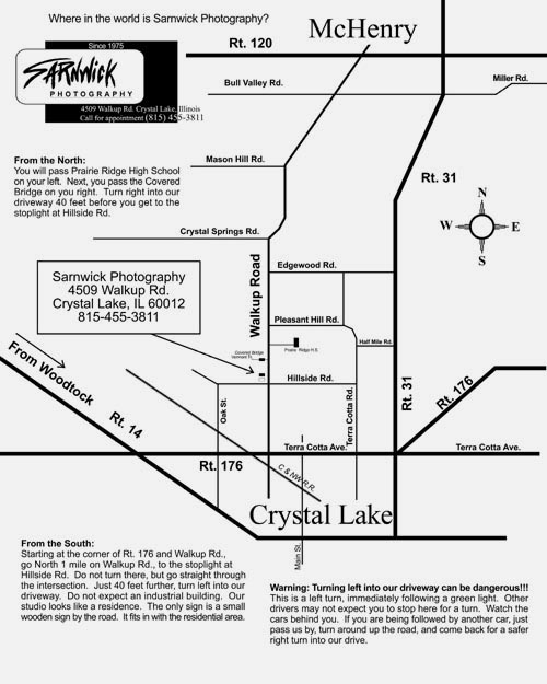 Sarnwick Photography serves the communities of Crystal Lake, McHenry County, Kane County, Cary, Woodstock, McHenry, Algonquin, Lakewood, Bull Valley, and Huntley. And also Spring Grove, Richmond, Harvard, Lakemoor, Volo, Chemung, Greenwood, Hebron, Alden, Barrington, Chicago, Illinois, Northern Illinois. We also create senior portraits for students at Prairie Ridge High School, Crystal Lake Central High School, Crystal Lake South High School, Cary Grove High School, McHenry High School, McHenry East High School, and McHenry West High School. Also Johnsburg High School, Jacobs High School, Woodstock High School, Huntley High School, Harvard High School. We provide photography, portraits, pictures, wall portraits, family portraits, group portraits, anniversary portraits, and engagement portraits. We also create family reunion photographs, color portraits, black and white portraits, black & white photography, Sarnwick Photography make children's portraits, children portrait, child portrait, infant, baby, toddler, child, children, and new born portraits. We also can make mother and child, parents, birth announcements, baby announcements Kevin designs senior portrait, senior portraits, graduation portrait, graduation portraits, and high school portraits. He also provides high school pictures, yearbook pictures, yearbook photos, hs portraits, hs pictures. We design publicity portraits, publicity pictures, head shot, head shots, pr photos, pr portraits, p.r. business portraits, and business pictures. We can also make head and shoulder portraits, model portfolios, model composites, models, fine art photography. We make advertising images, advertising photography, advertising photographs, illustrative images, illustrative photography, commercial images, commercial photography, and commercial photographs. We'll also make pet, dog, and team photos. We make id pictures, id photos, id photographs, FOID, FOID pictures, passport pictures, and passport photos. For our clients we provide photo copy and restoration, photo restoration, photo retouching, digital retouching, digital enhancement, and Photoshop work. For clients we provide web page design, the $25 web page, and the $25 web page. Sarnwick Photography supports fund raisers, donations, auction items. Groups we support include Rotary, Dawnbreakers, Family Alliance, NISRA, McHenry County Harley Owner's Group, HOG, H.O.G., Bunco for Breast Cancer, the Crystal Lake Interfaith Food Pantry, McHenry County Senior Services and the Adult and Child Rehabilitation Center. We offer outdoor portraits, location portraits, portraits in the park, gift certificates, Christmas cards, greeting cards, Valentine's Day gift, birthday gift, anniversary gift, free portrait session, free portrait, and free family portraits for deploying service persons.